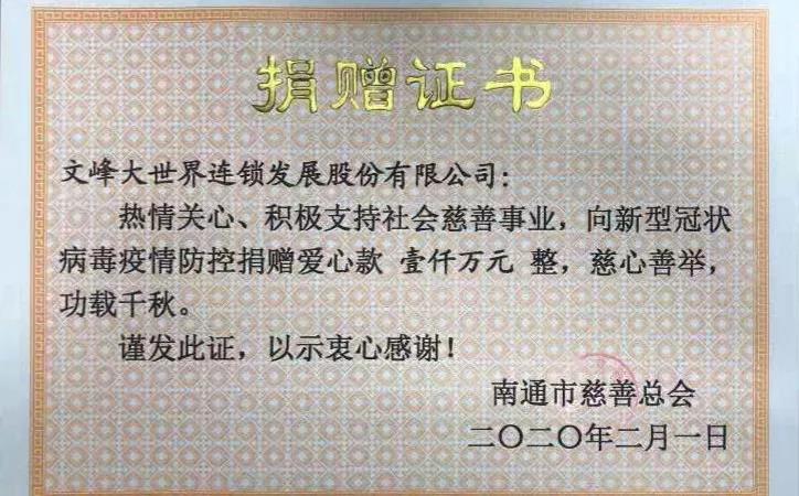 (2)2月3日-2月28日,以南通市文峰慈善公益基金會的名義向南通大學附屬醫院、南通第三人民醫院提供后勤保障物資,包括千家惠食品、洗護用品、文峰飯店及南通大飯店半成品食材,共計約65萬元,以實際行動支持醫務工作者,解除他們生活上的后顧之憂;