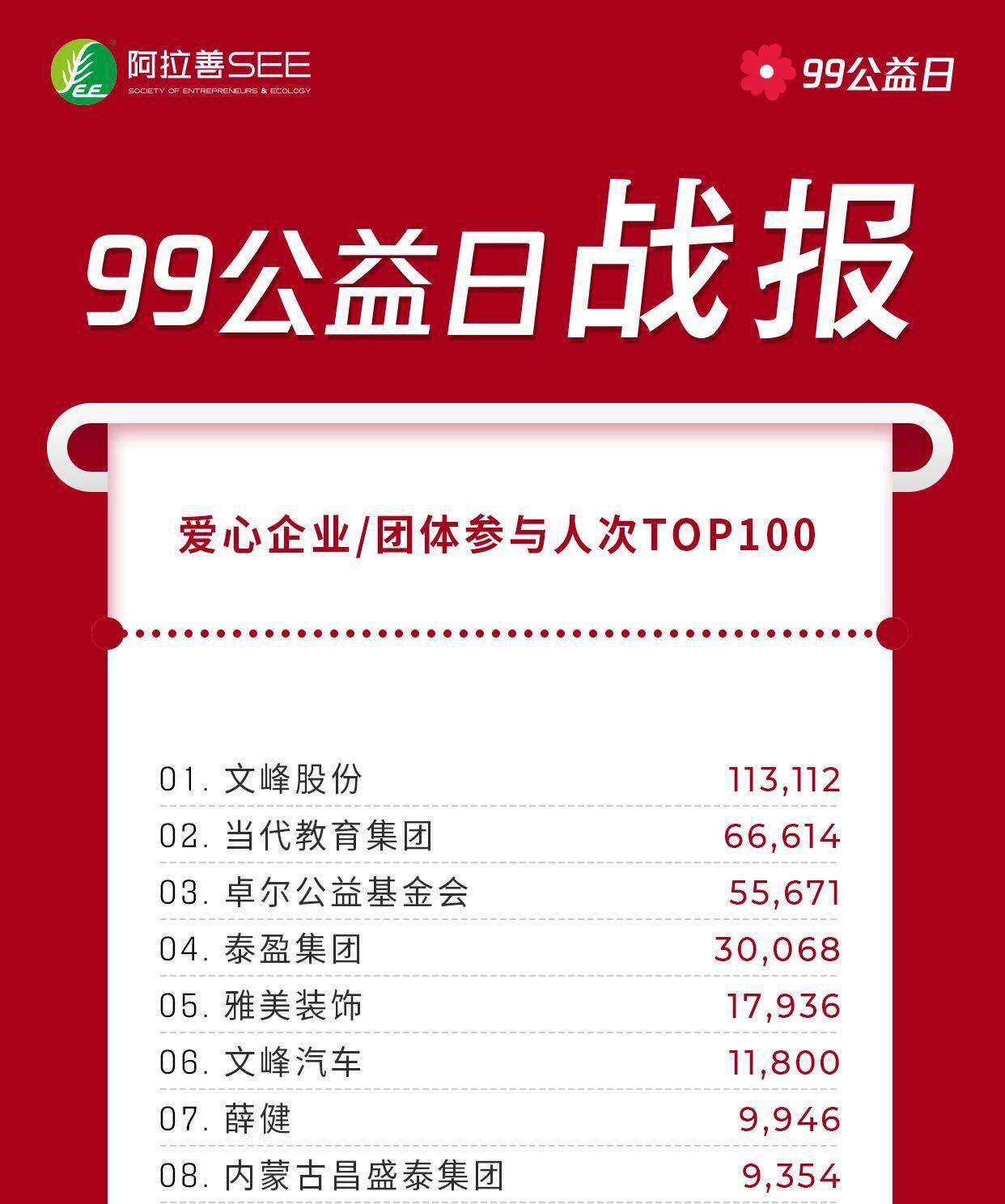 2019年99公益日三天(9月7、8、9日),阿拉善SEE公益機構共獲得 621,814人次支持,3,678萬元善款。