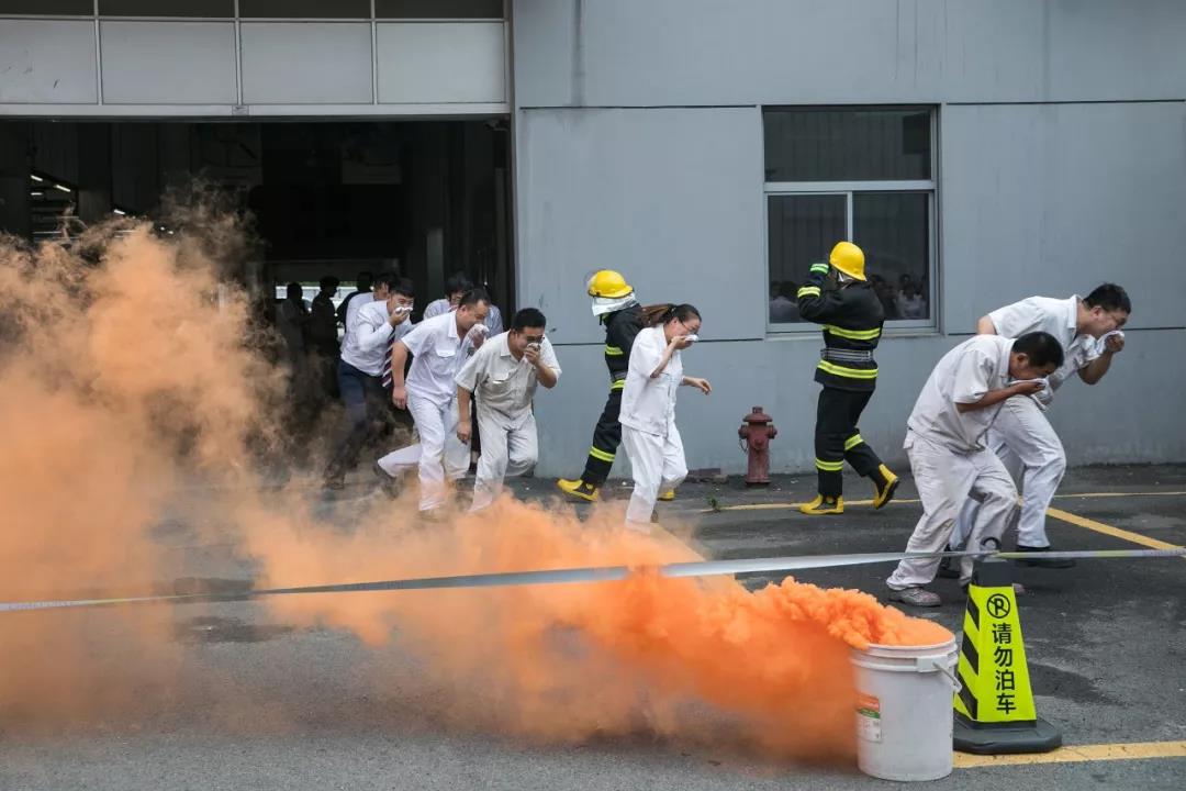 消防安全知識培訓(xùn)結(jié)束后,相關(guān)人員來到模擬火災(zāi)發(fā)生點(diǎn)。隨著警報(bào)聲的拉響,實(shí)操演練正式拉開帷幕。相關(guān)人員在總指揮——廣汽豐田總經(jīng)理王祖安的帶領(lǐng)下,有序撤離火災(zāi)現(xiàn)場。