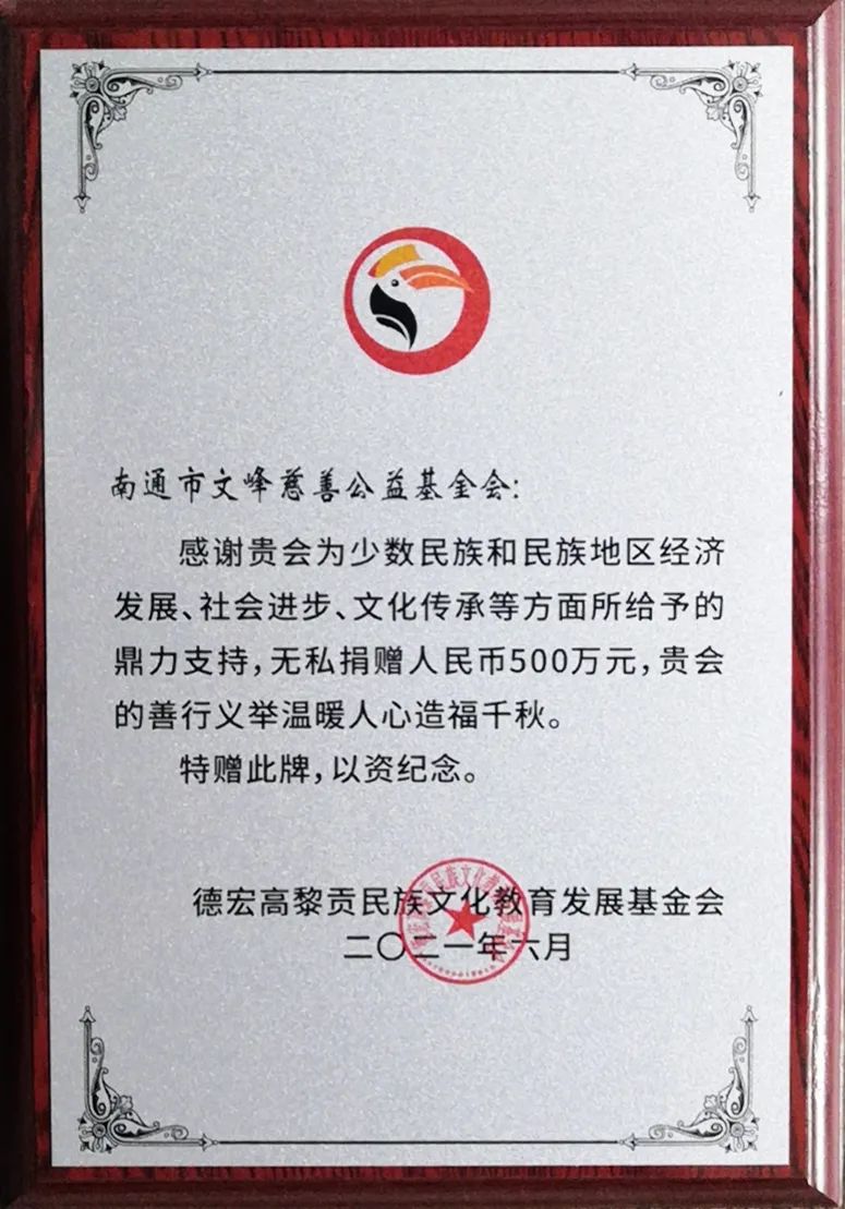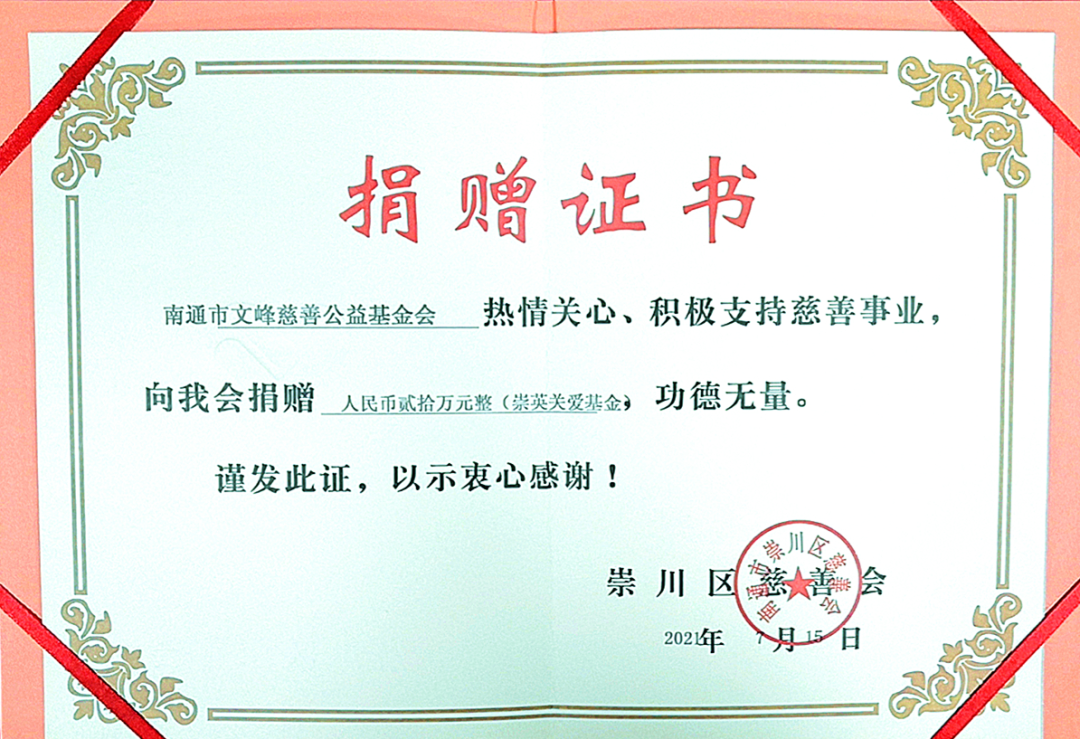 2021年9月,江蘇文峰集團(tuán)榮獲“南通慈善獎(jiǎng)”最具愛心捐贈企業(yè)稱號。