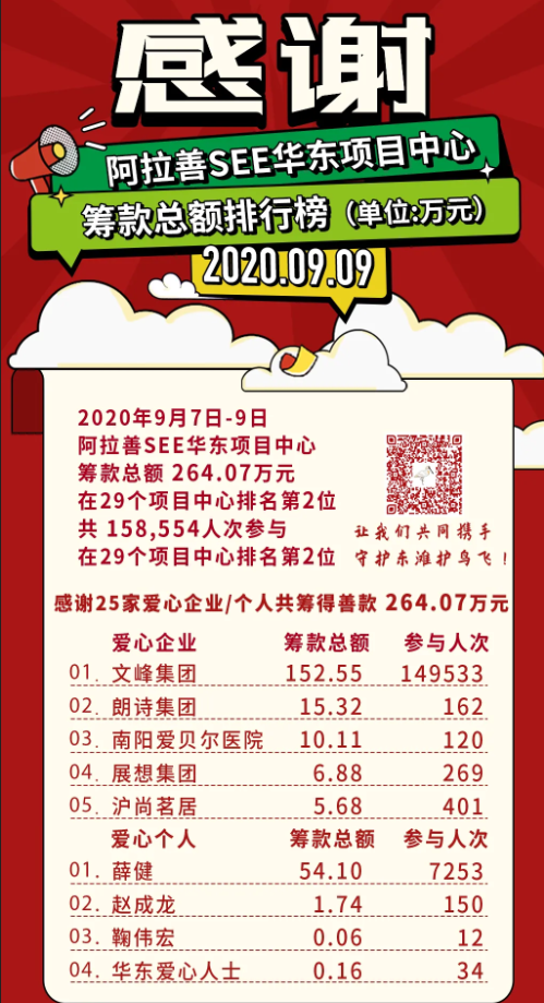 在阿拉善SEE華東項目中心發布的「籌款總額排行榜」中,江蘇文峰集團籌款總額為152.55萬元,參與人次達到了149533次,排在榜單的首位;江蘇文峰集團董事長薛健籌款總額為54.1萬元,參與人次7253次。2020年“99公益日”江蘇文峰集團共籌款206.65萬元。