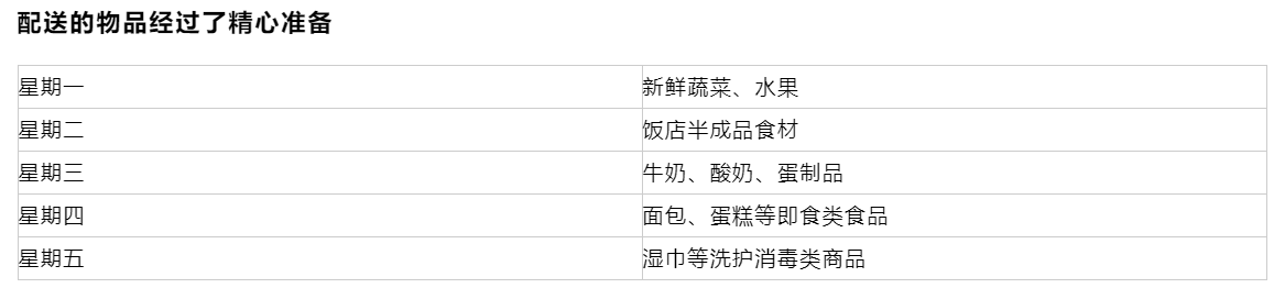 按計(jì)劃,從2月3日開(kāi)始,分別由文峰集團(tuán)下屬的文峰千家惠、 文峰飯店和南通大飯店每天按品類配送食材。以五天為一個(gè)周期,連續(xù)配送4個(gè)星期,到2月28日配送完畢。