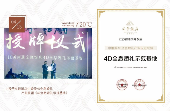 2019年4月,文峰飯店舉辦了《2019春季4D全息婚SHOW星光文化展》,南通市原副市長、旅游協(xié)會會長朱晉;南通市委宣傳部文化改革發(fā)展處處長顧凡;南通市商務(wù)局副局長楊丁勇等領(lǐng)導(dǎo)出席了活動,中婚委4D全息婚禮產(chǎn)業(yè)聯(lián)盟授予文峰飯店《4D全息婚禮示范基地》。
