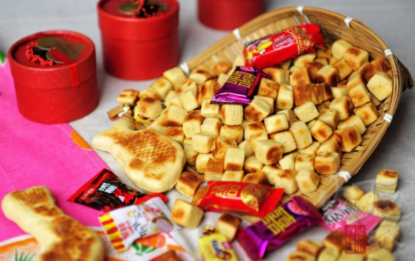 巧果品種極多,主要原料是油、面、糖、蜜。是將發(fā)面團放入具有梨、茄、瓜、石榴、蘋果、小雞、小豬、小獅子、金魚、蛙、蟹、蝦等各種花形圖案的木模(也叫榼子)中,將成形后的小餅油炸或烙食。有些巧果還被點染為七色,有的以紅色點染,用長線穿成串,尾端系沙果或花布,掛于壁間,以為裝飾和零食,也有串成一環(huán)掛在小兒項間取樂的。相傳七夕節(jié)晚上,婦女兒童將巧果拋擲屋背,喜鵲銜去搭橋,讓牛郎織女夜渡銀河相會。