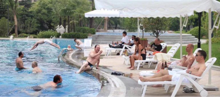 文峰飯店的豪華露天泳池,是客人消夏避暑的好去處。泳池旁,石獅獻水,綠意環繞,石徑悠長。白色的納涼傘下,清風徐來,愜意優雅。傾聽水之語,感受魚之樂,與陽光為伴,在池中暢游,讓人樂不思“暑”。
