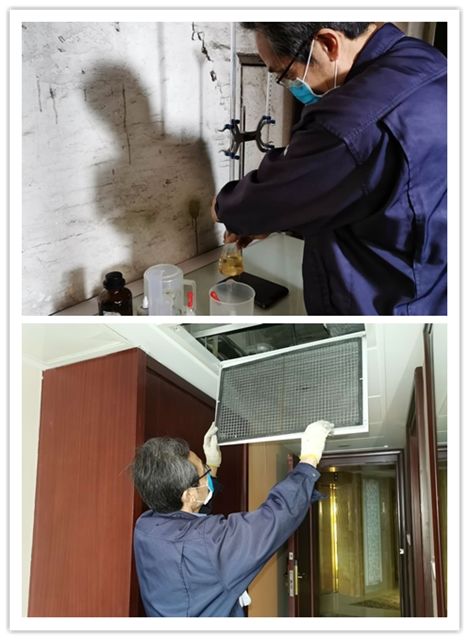南通大飯店擁有近700間客房,空調(diào)消毒、清潔的任務(wù)繁重。為保證顧客和員工的安全與健康,姚海群帶領(lǐng)同事對(duì)飯店的空調(diào)通風(fēng)系統(tǒng)進(jìn)行了全面維護(hù),從空調(diào)消毒劑的選擇到業(yè)務(wù)的操作流程,他們都制定了嚴(yán)格的標(biāo)準(zhǔn)和規(guī)則,并認(rèn)真貫徹執(zhí)行。清洗空調(diào)的過(guò)濾網(wǎng)、出風(fēng)口和回風(fēng)口,姚海群和同事們對(duì)每一個(gè)環(huán)節(jié)都一絲不茍。在完成空調(diào)系統(tǒng)空氣處理機(jī)和客房空調(diào)的清洗消毒工作之外,他們還要對(duì)所有設(shè)備進(jìn)行檢測(cè)和維護(hù),讓設(shè)備能夠隨時(shí)正常工作,以保證室內(nèi)空氣的清新。